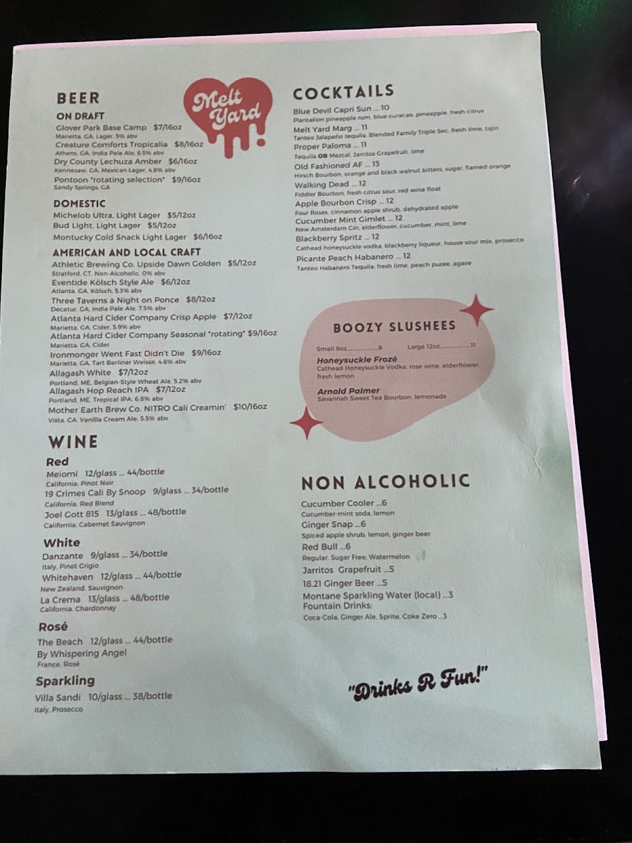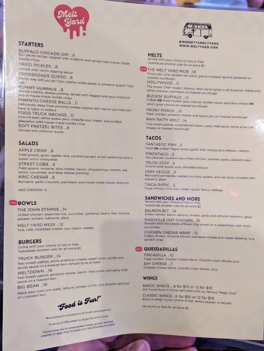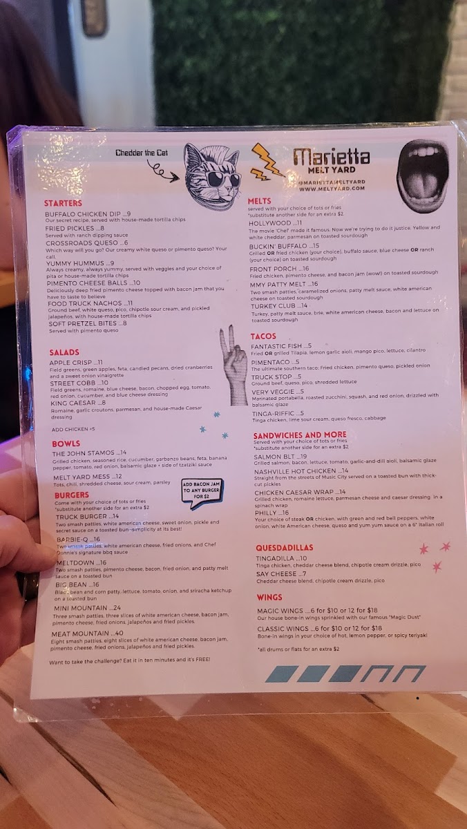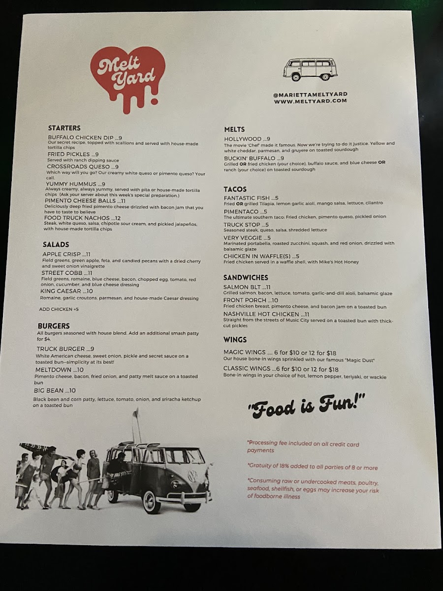 Located at 800 Whitlock Ave NW in Marietta, GA, Marietta Melt Yard invites guests to indulge in a nostalgic dining experience. This retro-themed eatery offers a lively atmosphere perfect for family gatherings, friendly hangouts, or even a relaxing meal alone. Patrons rave about the unique blend of diner and carnival-style food, with crowd favorites like juicy burgers, crispy tots, and flavorful salads.